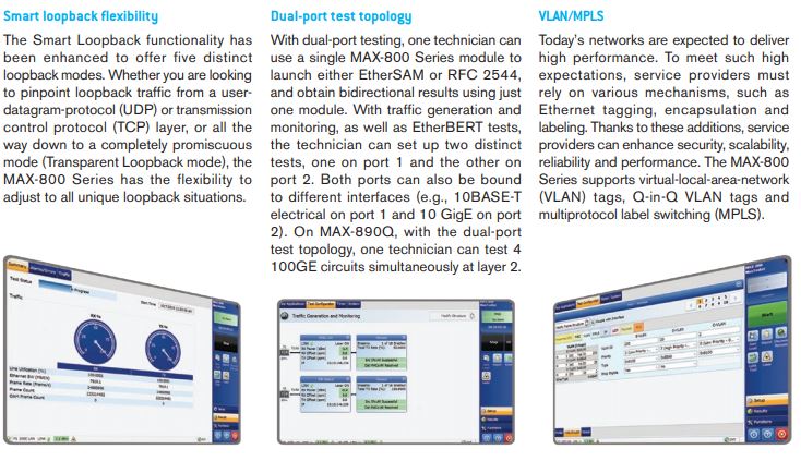 The MAX-800 Series is an easy-to-use, portable test solution designed to meet the most stringent test requirements when installing, activating and troubleshooting Ethernet connections and transport links from 10M to 100G.